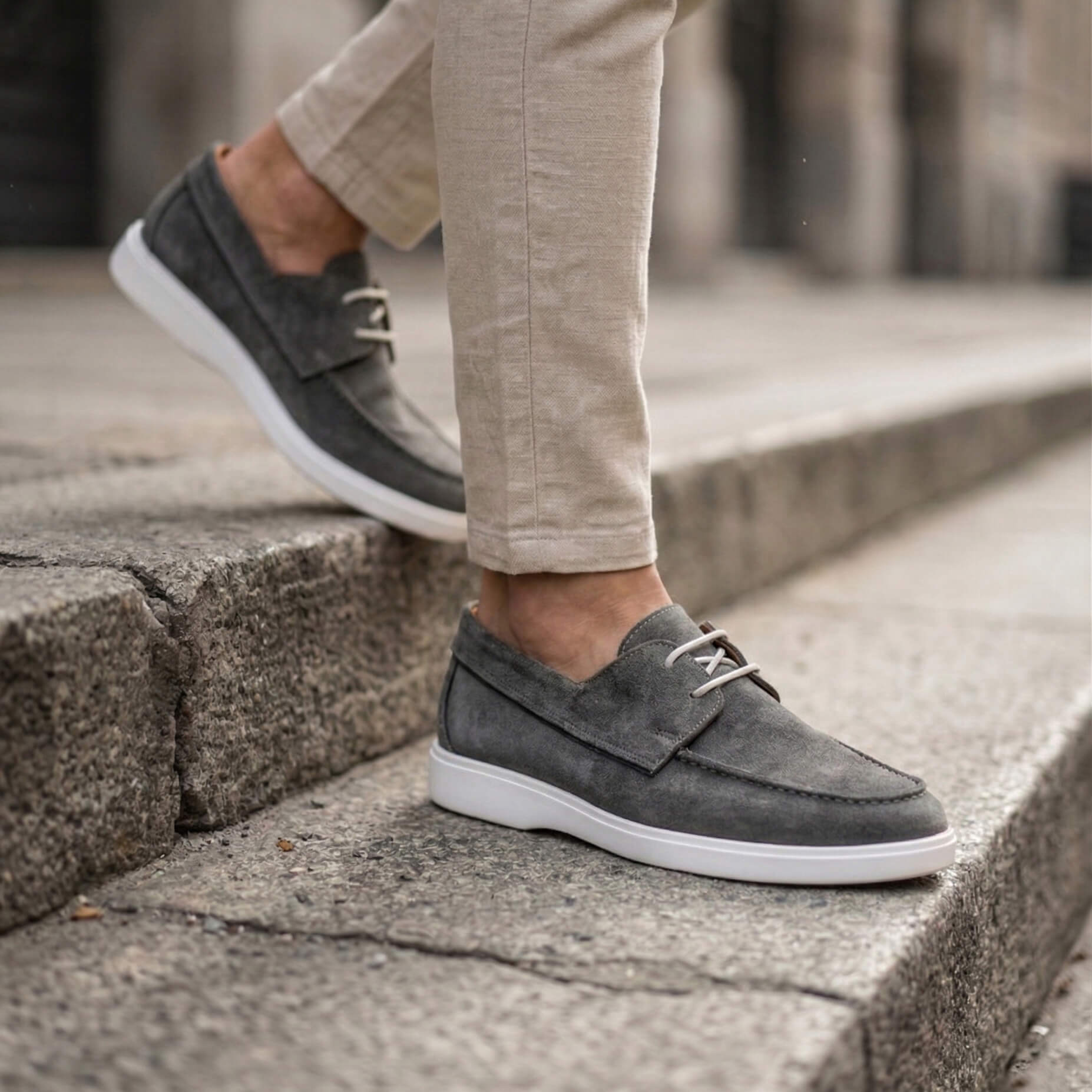 • خامات طبيعية 100%: الجزء العلوي مصنوع من أجود أنواع الشمواه (الجلد الطبيعي) الذي يمنح الحذاء مظهراً مخملياً جذاباً ولمسة من الفخامة التي تدوم طويلاً.