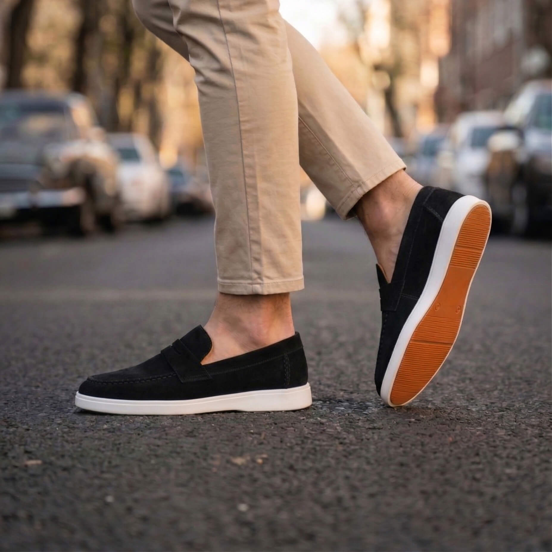 • خامات طبيعية 100%: الجزء العلوي مصنوع من أجود أنواع الشمواه (الجلد الطبيعي) الذي يمنح الحذاء مظهراً مخملياً جذاباً ولمسة من الفخامة التي تدوم طويلاً.