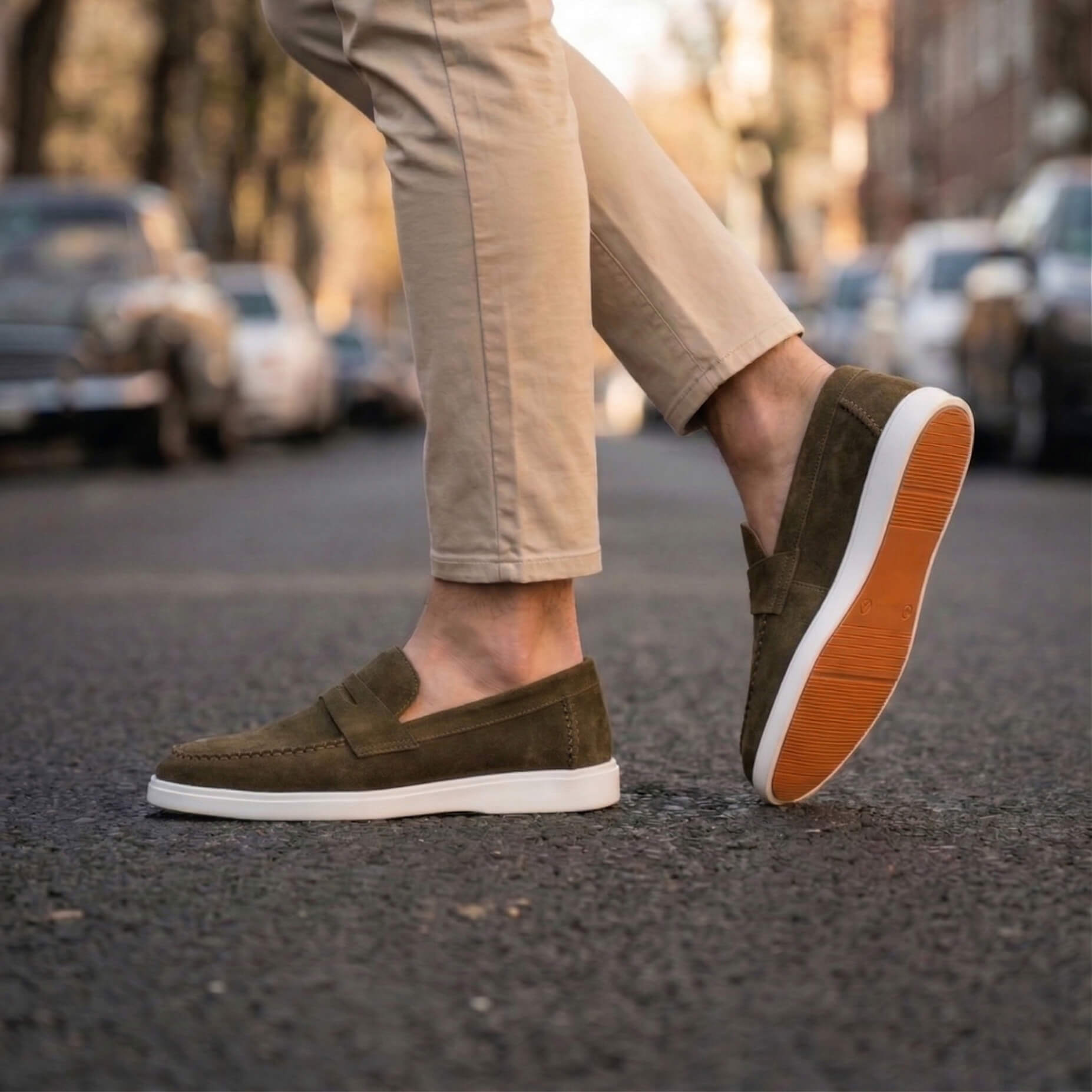 • خامات طبيعية 100%: الجزء العلوي مصنوع من أجود أنواع الشمواه (الجلد الطبيعي) الذي يمنح الحذاء مظهراً مخملياً جذاباً ولمسة من الفخامة التي تدوم طويلاً.