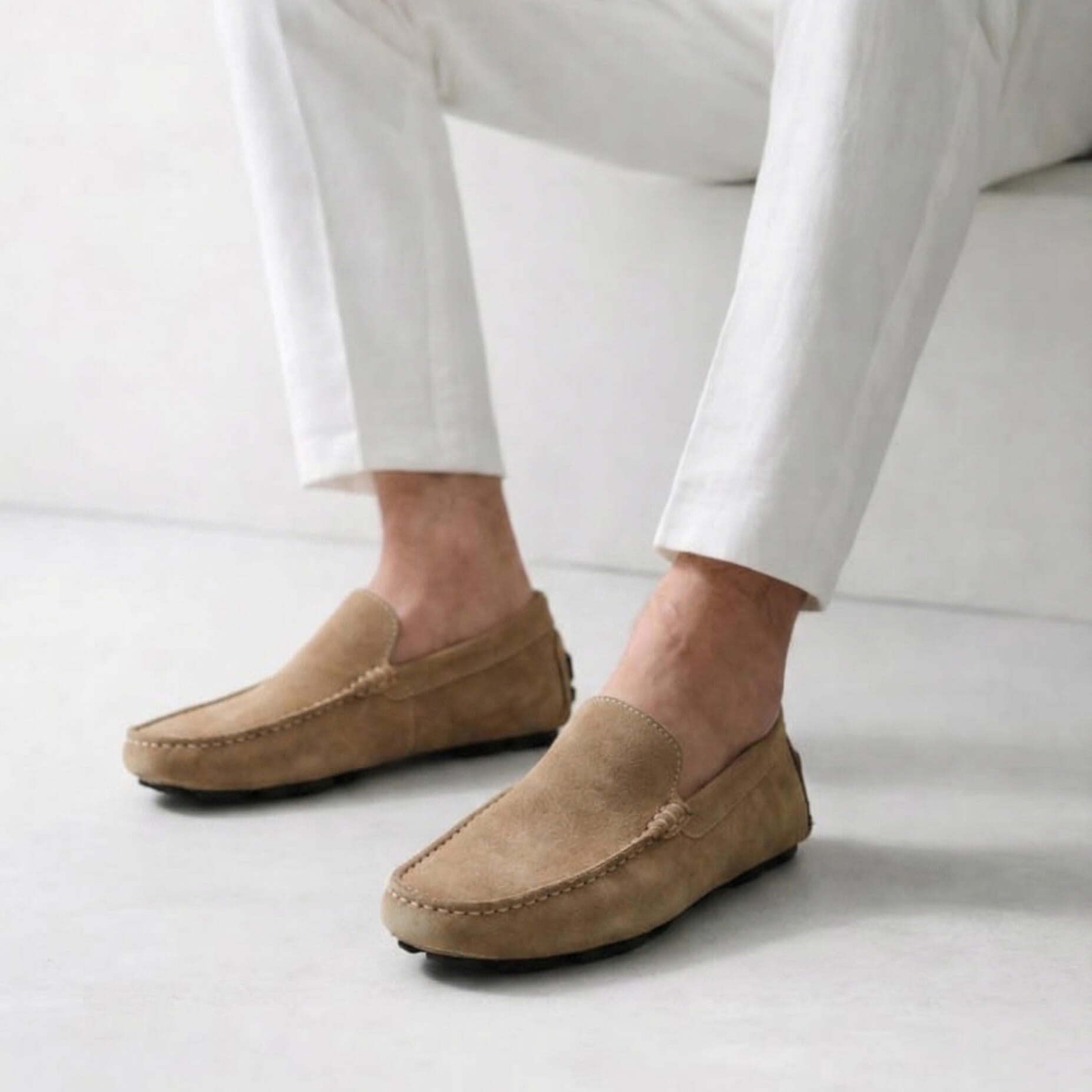 خامات طبيعية 100%: الجزء العلوي مصنوع من أجود أنواع الشمواه (الجلد الطبيعي) الذي يمنح الحذاء مظهراً مخملياً جذاباً ولمسة من الفخامة، .